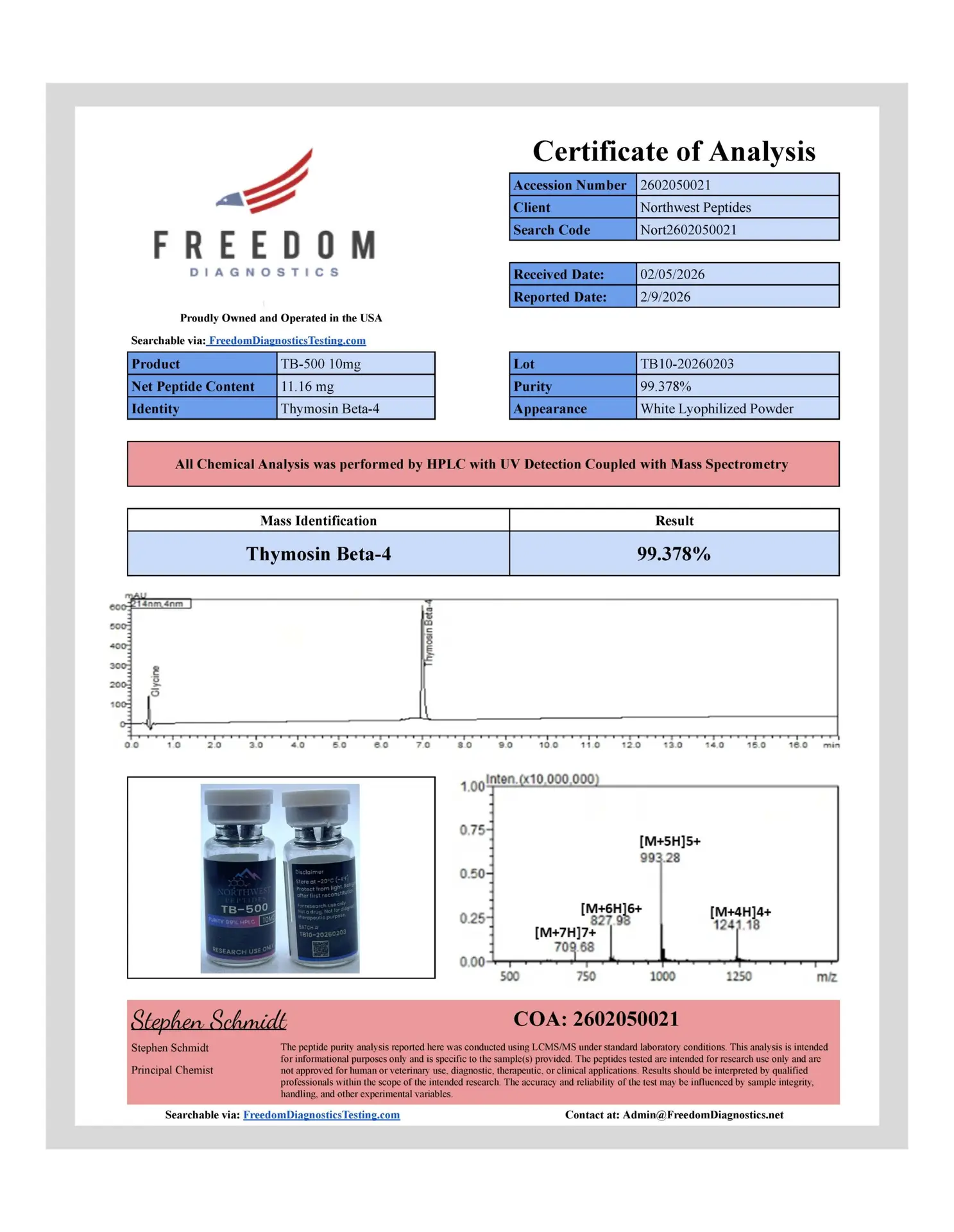 For documentation or batch questions related to TB-500 research peptide, contact support@northwestpeptides.com